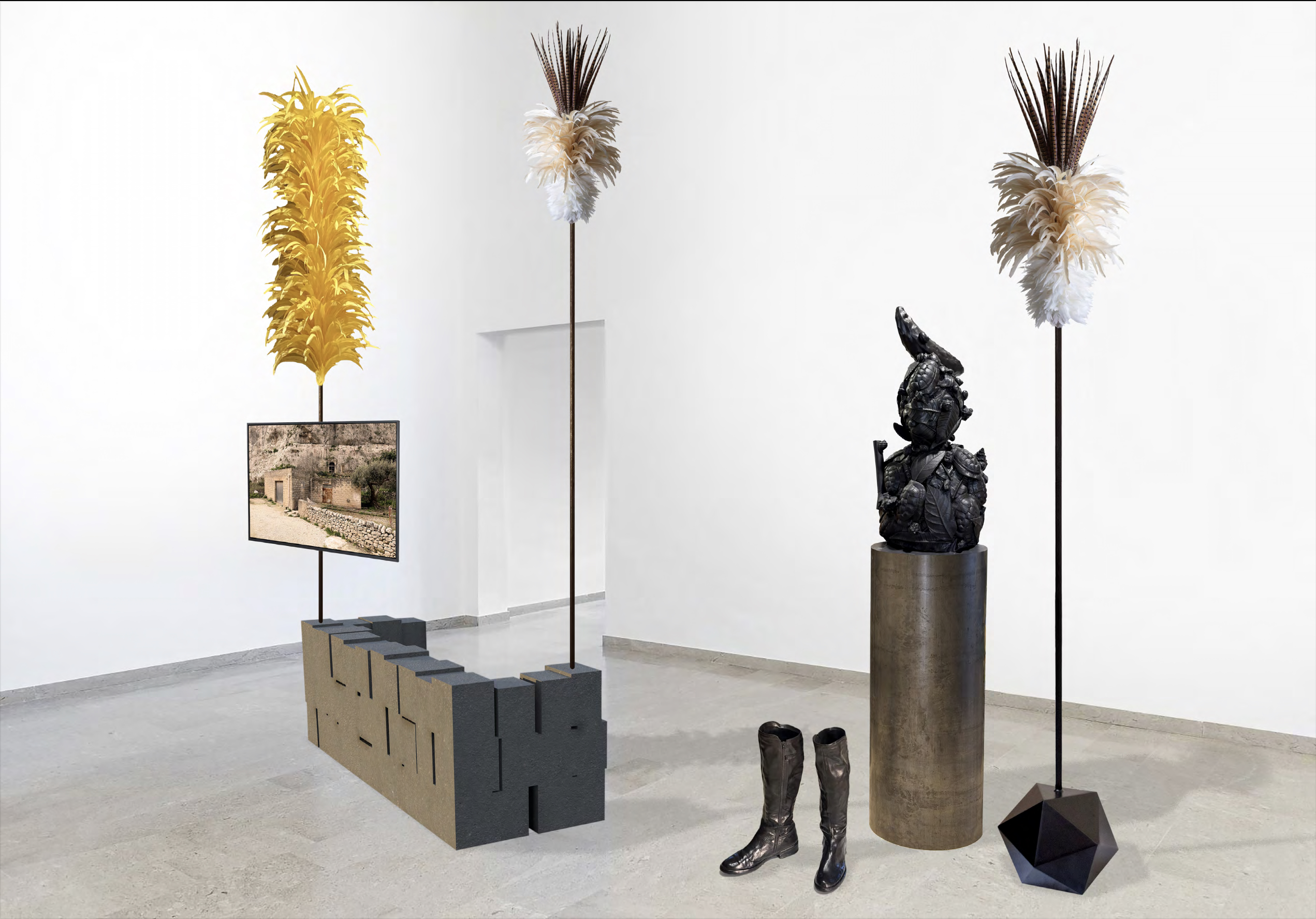 Installazioni, pittura, scultura, suoni, testi e interventi visivi si intrecciano in uno spazio espositivo dinamico, caratterizzato da una costruzione non lineare e da una forte componente immersiva.