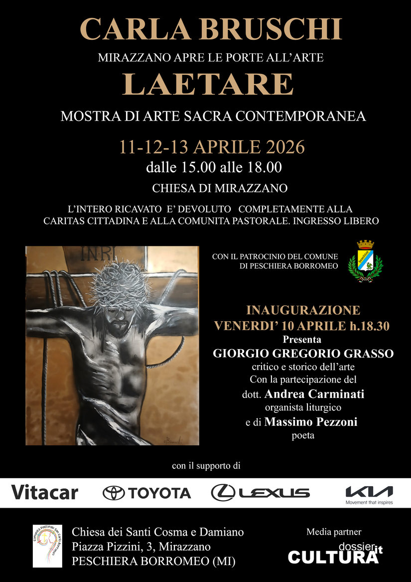 A Mirazzano, frazione di Peschiera Borromeo (MI), arte e solidarietà si incontrano in un’iniziativa destinata a lasciare il segno. Dal 10 al 13 aprile 2026, nella chiesa dei Santi Cosma e Damiano in piazza Pizzini, prende vita “Laetare”, mostra di arte sacra contemporanea firmata da Carla Bruschi, artista peschierese riconosciuta anche a livello internazionale. L’inaugurazione è fissata per venerdì 10 aprile alle ore 18.30, mentre nei giorni successivi l’esposizione sarà visitabile dalle 15.00 alle 18.00 con ingresso libero.