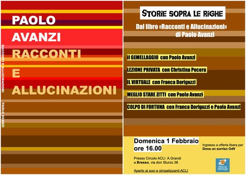 Rappresentazione dello spettacolo “Storie sopra le righe” basato su “Racconti e allucinazioni” dell’autore. Domenica 1 Febbraio 2026. Ore 16.00 alla sala grande del Circolo ACLI A. Grandi di Bresso (Mi) in via Don Sturzo 38. Leggi »